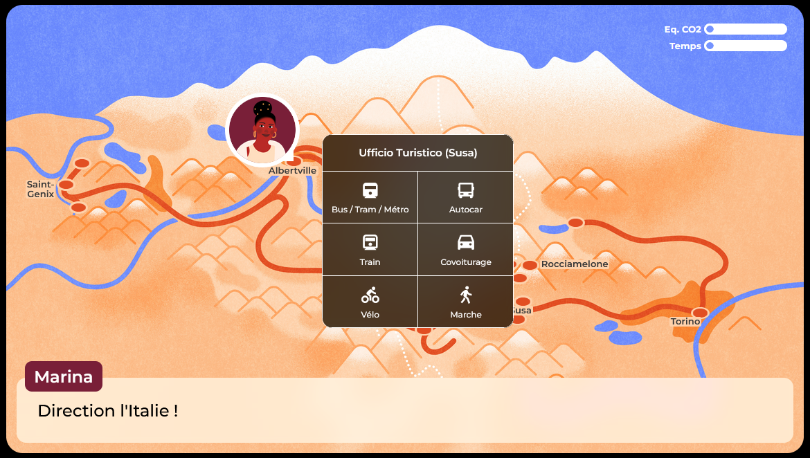 L’aventure peut être jouée en autonomie, alors vous devrez apprendre à découvrir les secrets pour planifier vos déplacements grâce à plusieurs modes de transports, avec la possibilité sur votre trajet de découvrir des pépites culturelles et magnifiques paysages de nos territoires alpins. L’aventure pourra aussi être jouée en classe, en étant accompagnée par un enseignant dans le cadre d’une séquence pédagogique à destination d’élèves de niveau collège. A partir de l’expérience ludique vécue à travers ce jeu numérique, les jeunes pourront découvrir et mieux appréhender des notions clés liées à nos modes de déplacements et les enjeux de la mobilité durable.